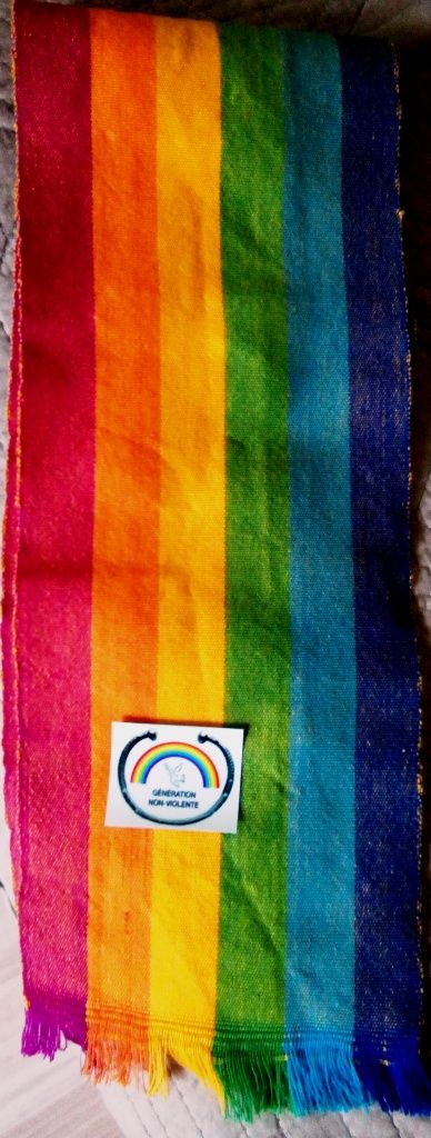 L'écharpe aux couleurs de l'arc-en-ciel, signe de la paix, que les jeunes porteront ou brandiront, matérialise leur engagement dans la Non-Violence et pour la paix.