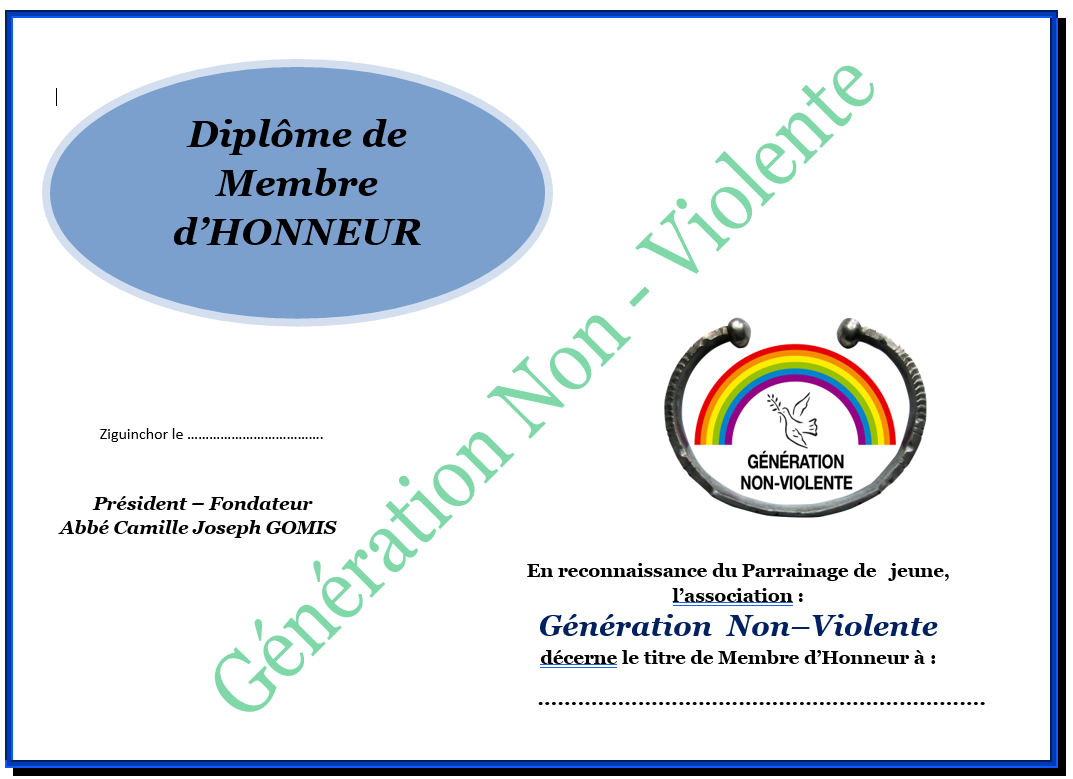 L'on devient Membre d'Honneur du Mouvement Génération Non-Violente lorsqu'on accepte de parrainer (financièrement et moralement) un ou plusieurs jeunes dans leur engagement.